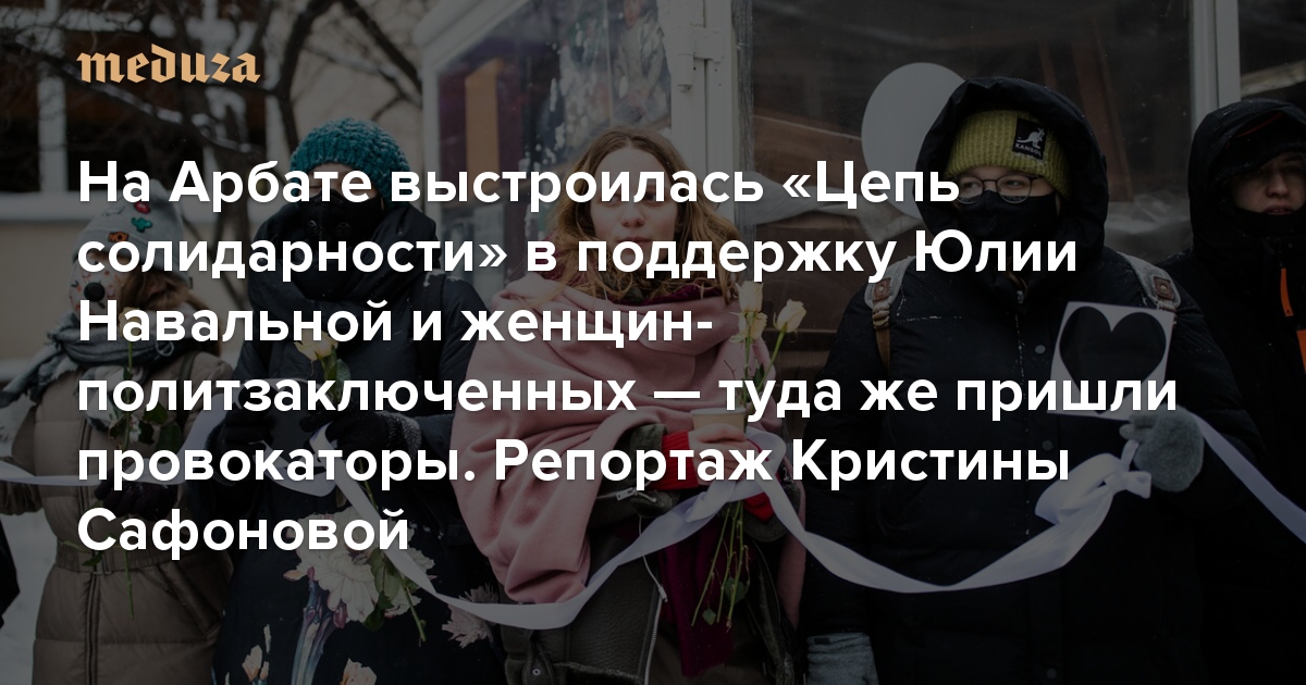 Днем 14 февраля в Москве прошла акция в поддержку Юлии Навальной, женщин-политзаключенных и всех, кто «проводит свои дни в судах, полицейских автобусах и спецприемниках» — несколько сотен человек выстроились в «Цепь солидарности» на Арбате. Туда же пришли провокаторы — они оскорбляли девушек и намекали, что те протестуют за деньги. О том, как прошла акция, рассказывает спецкор «Медузы» Кристина Сафонова.