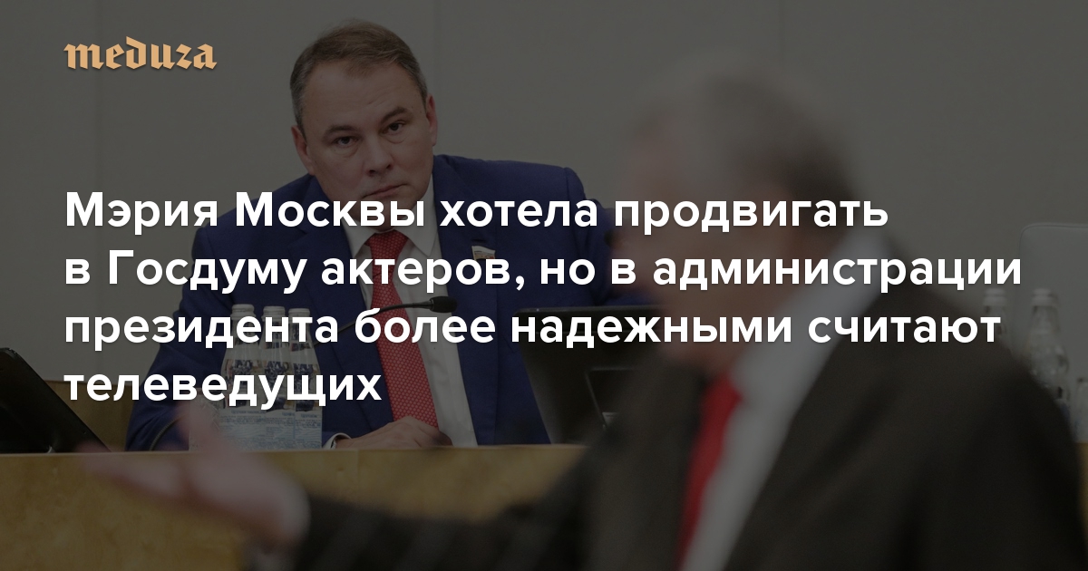 Кроме того, утверждают источники «Медузы», как возможных кандидатов в Госдуму от столицы в мэрии рассматривали актера Владимира Машкова и режиссера Алексея Учителя. О том, что в депутаты могут баллотироваться Дмитрий Певцов и Сергей Капков, писал и «Коммерсант».
