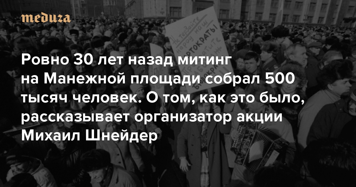 «Было ощущение, что все получится и наступит светлое будущее» Ровно 30 лет назад митинг на Манежной площади собрал 500 тысяч человек. О том, как это было, рассказывает организатор акции Михаил Шнейдер