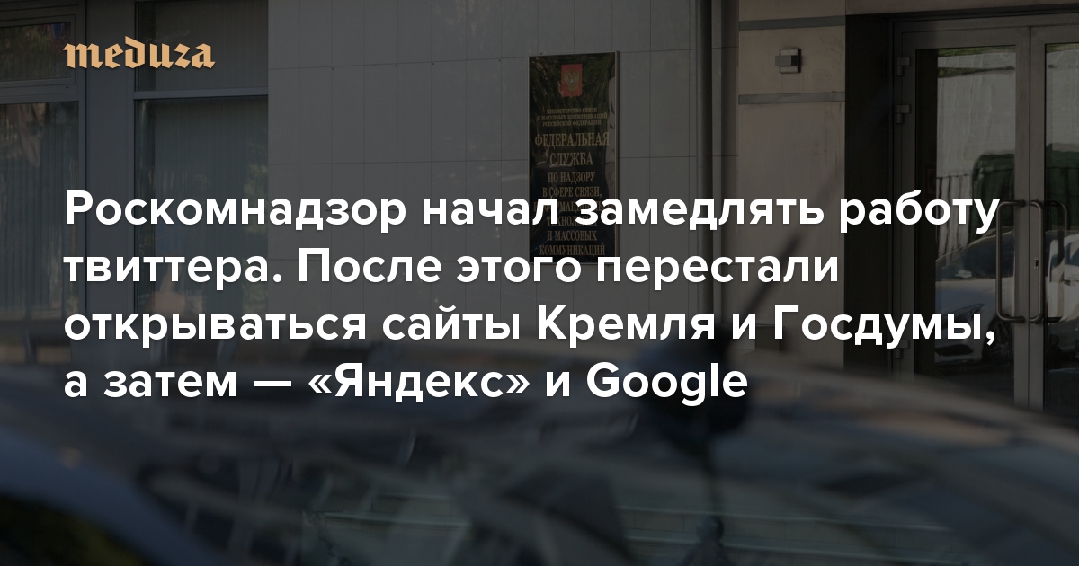 Роскомнадзор начал замедлять работу твиттера. После этого перестали открываться сайты Кремля и Госдумы, а затем — «Яндекс» и Google Правительство ссылается на сбои в работе «Ростелекома»