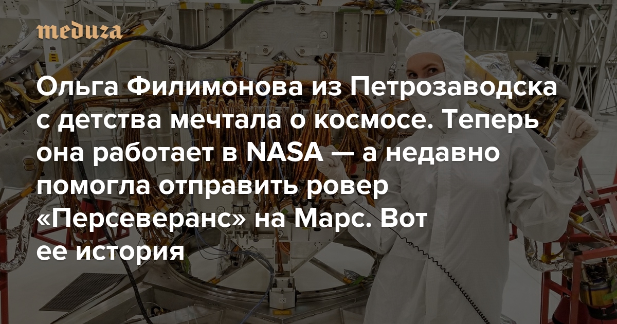 Ольга Филимонова выросла в Петрозаводске. Она с детства мечтала о космосе и увлекалась математикой, но не смогла поступить на профильный факультет Санкт-Петербургского университета — и переключилась на филологию. Однако потом уехала по образовательной программе в США и вновь вернулась к мечтам о космосе. Сейчас Филимонова уже больше шести лет работает инженером в NASA. Среди прочего она участвовала в отправке на Марс ровера «Персеверанс», который сел на планету в феврале 2021 года. «Медуза» записала рассказ Филимоновой о «Персеверансе», NASA — и, конечно, об освоении космоса.