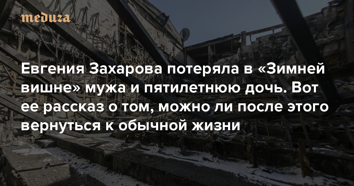 Ровно три года назад — 25 марта 2018-го — в Кемерово загорелся торговый центр «Зимняя вишня». Погибли 60 человек, в том числе 37 детей. Некоторые потеряли в пожаре всю семью. Среди них — 34-летняя Евгения Захарова. В «Зимней вишне» погибли ее муж Станислав и их пятилетняя дочь Вика. Прямо перед тем, как начался пожар, они отправили Евгении селфи из кинозала. «Медуза» записала рассказ Захаровой о том, как она переживала потерю близких и благодаря чему смогла вернуться к нормальной жизни.