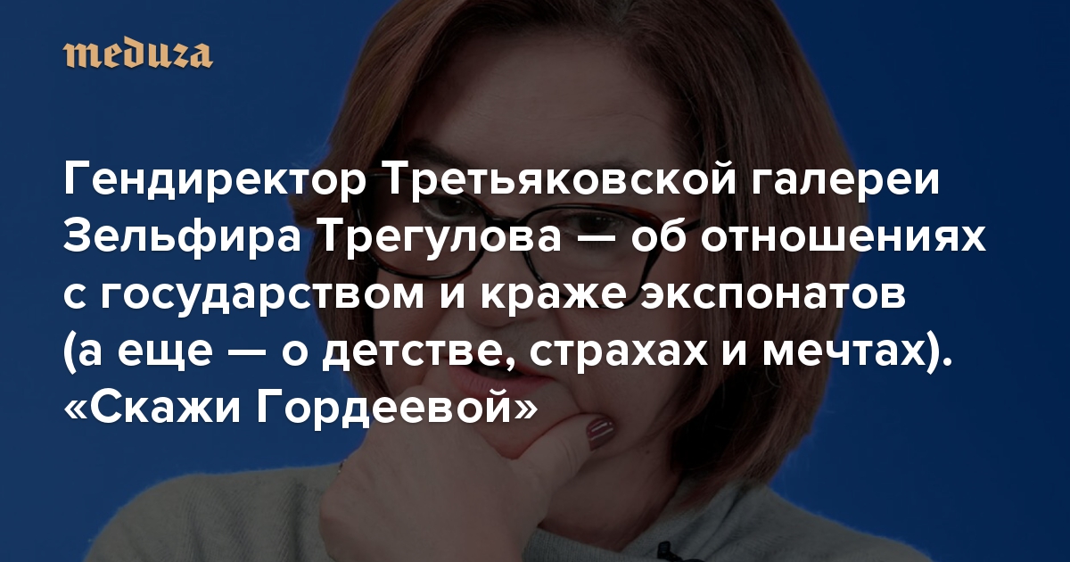 Зельфира Трегулова — генеральный директор Третьяковской галереи, главного музея национального искусства в России. В новом выпуске «Скажи Гордеевой» Зельфира Трегулова и Катерина Гордеева обсуждают, каково это — руководить такой колоссальной культурной институцией, и говорят о тайнах картин, известных нам с детства. Шоу Катерины Гордеевой теперь выходит на отдельном ютьюб-канале, который называется Meduza Originals. Подпишитесь на него, чтобы не пропустить новые эпизоды.