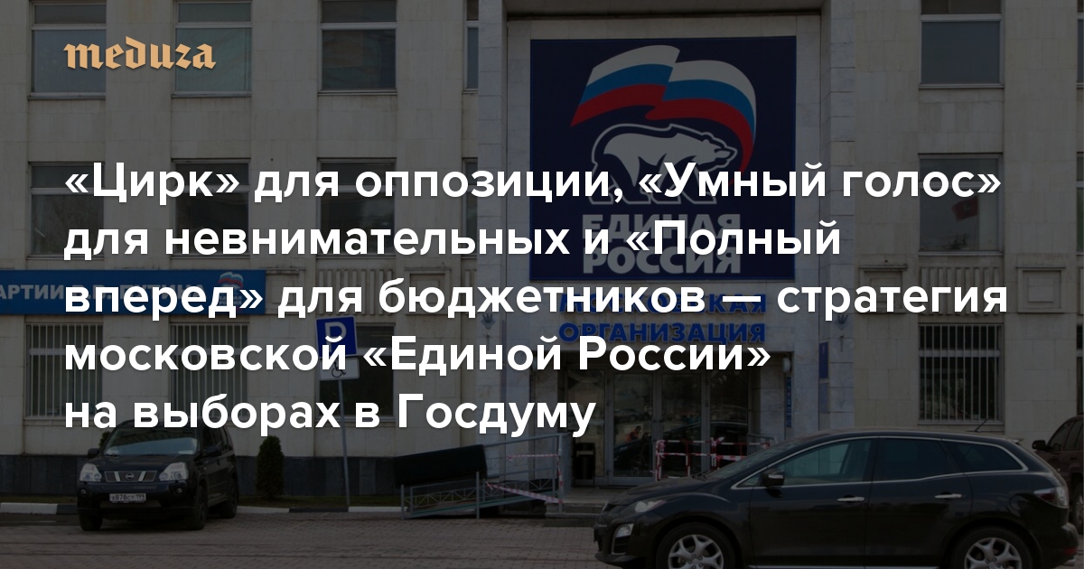 «Цирк», «Умный голос» и «Полный вперед» — новая стратегия партии власти в Москве На выборах в Госдуму «Единая Россия» надеется расколоть оппозицию, обмануть невнимательных и (как всегда) мобилизовать бюджетников