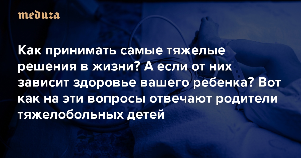 Одной из героинь этого текста врач посоветовал сделать аборт, сказав, что ребенок проживет меньше минуты. Другим пришлось решать, проводить ли опасные для жизни их детей медицинские операции. А также бороться за постановку правильного диагноза и необходимое лечение. Родители тяжелобольных детей рассказали «Медузе», как они принимают самые тяжелые решения в их жизни — и как справляются с их последствиями.