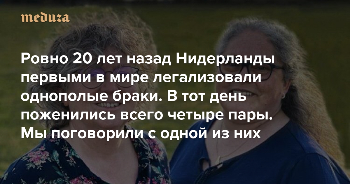 Ровно 20 лет назад, 1 апреля 2001 года, в Нидерландах вступил в силу закон, легализующий однополые браки. Сразу после этого в Амстердаме обручились четыре ЛГБТ-пары — они стали первыми в мире официально зарегистрированными однополыми супругами. «Медуза» разыскала одну из этих пар — голландок Анне-Мари Тус и Хелен Фаасен. Вот что они нам рассказали.