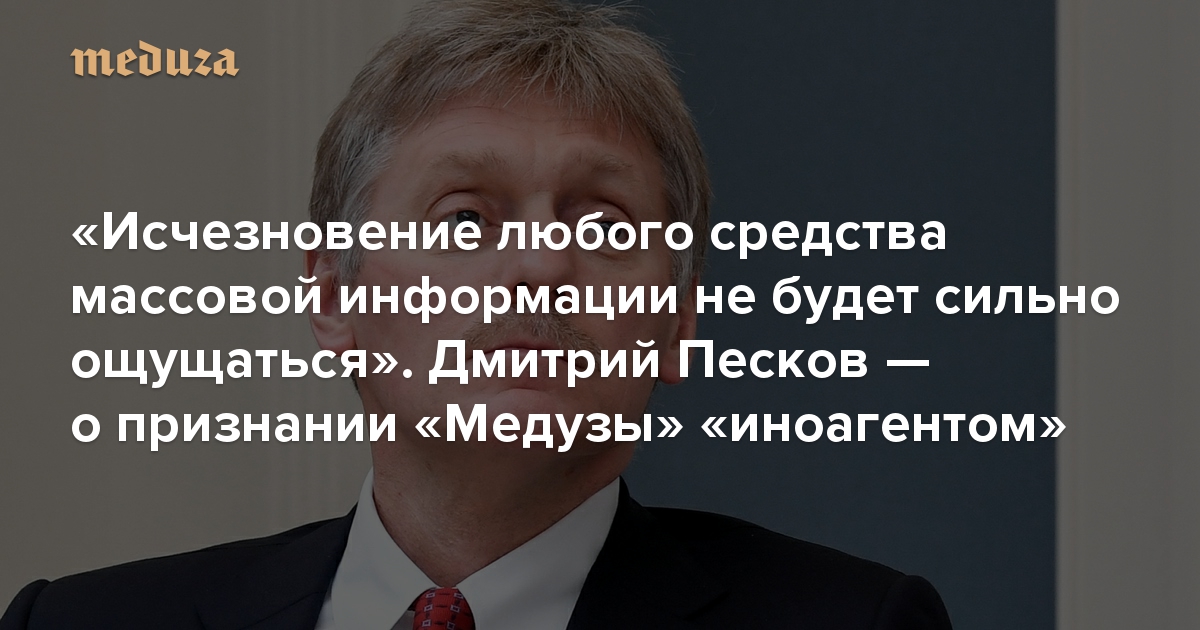 «Исчезновение любого средства массовой информации не будет сильно ощущаться». Дмитрий Песков — о признании «Медузы» «иноагентом»