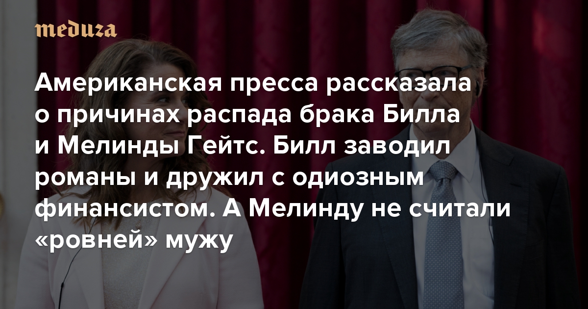 16 мая сразу несколько американских изданий — The New York Times, The Wall Street Journal и Daily Beast — выпустили статьи о причинах развода миллиардера, основателя Microsoft Билла Гейтса и его жены Мелинды. Пара объявила о расставании в начале мая, и с тех пор Мелинда получила от инвестиционной компании Билла активы на три миллиарда долларов. Между тем, согласно сведениям NYT, WSJ и Daily Beast, Гейтсы давно отдалились друг от друга, Билл ухаживал за другими женщинами (ему даже пришлось уйти из совета директоров Microsoft из-за служебного романа) и жаловался на Мелинду своему знакомому, финансисту Джеффри Эпштейну, которого обвиняли в преступлениях сексуального характера и который в итоге покончил с собой в тюрьме.