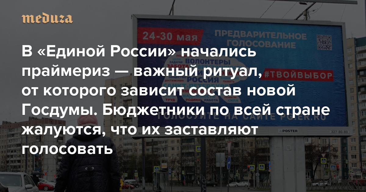 24 мая начались праймериз «Единой России». Именно там во многом определятся кандидаты, которые пойдут от партии власти на выборы в Госдуму в сентябре 2021 года. Из-за ковида голосование проходит в электронном формате — и бюджетники из разных регионов России жалуются, что их заставляют участвовать в нем под угрозой увольнения. «Медуза» рассказывает, зачем «Единой России» вообще понадобились праймериз — и как они повлияют на результаты сентябрьских выборов.
