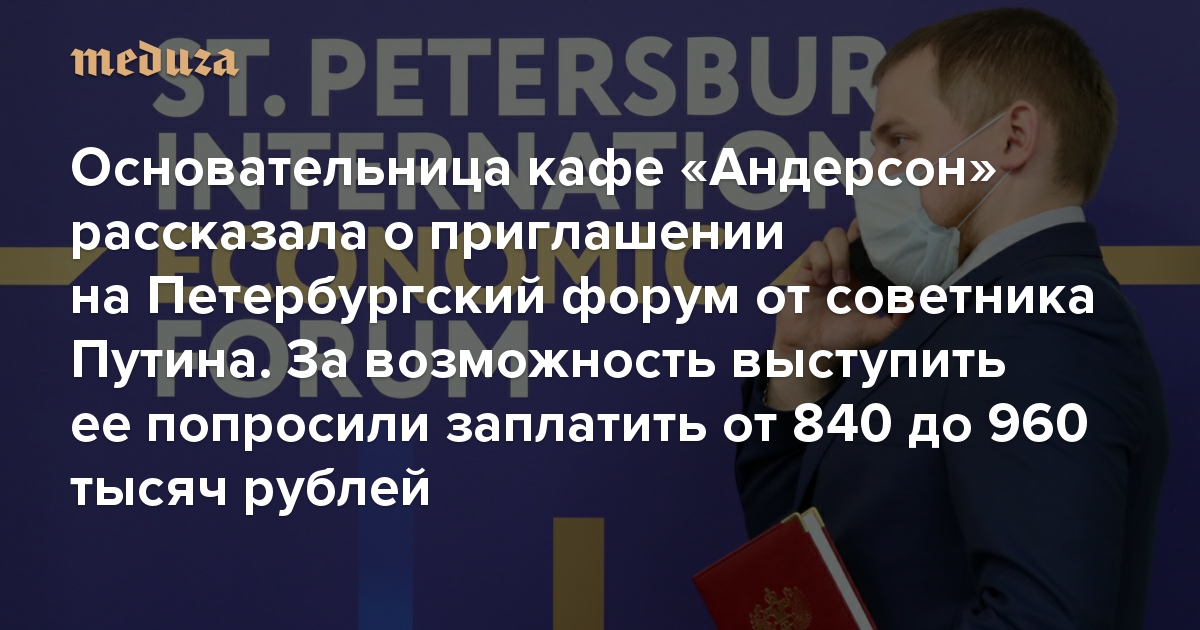 Основательница кафе «Андерсон» рассказала о приглашении на Петербургский форум от советника Путина. За возможность выступить ее попросили заплатить от 840 до 960 тысяч рублей
