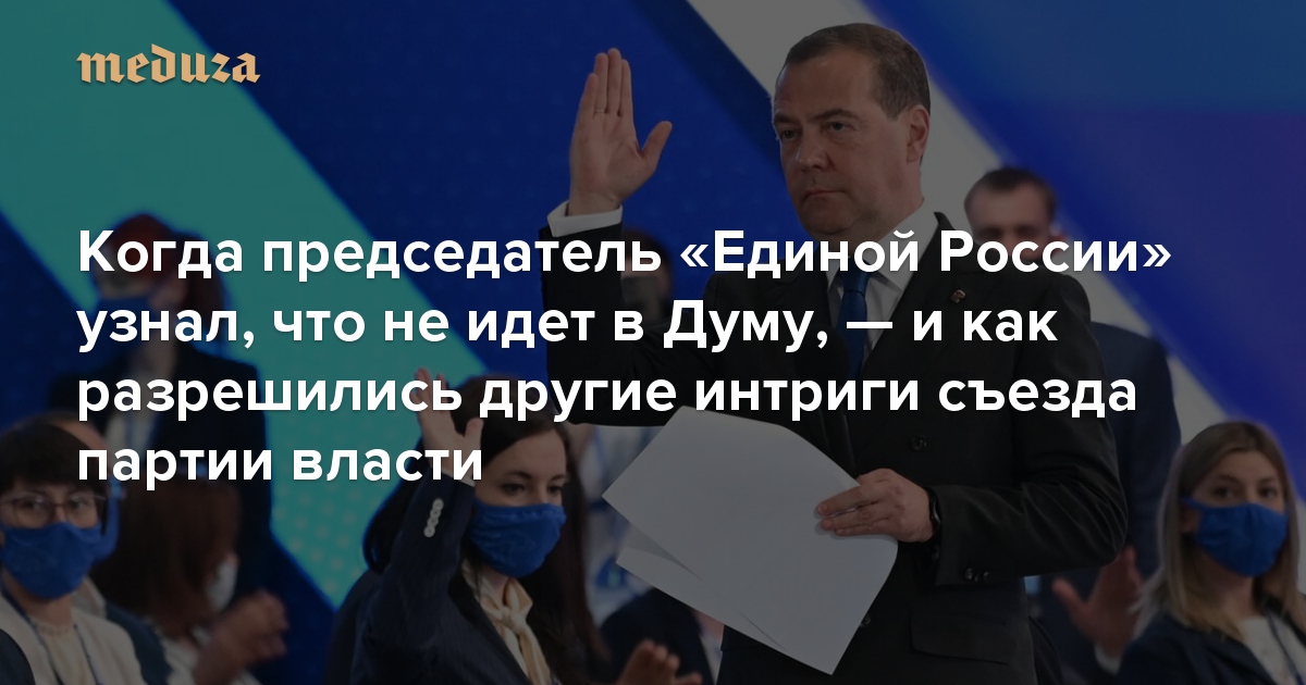 Главной неожиданностью съезда «Единой России» стало невключение председателя партии Дмитрия Медведева в федеральный список. Собеседник «Медузы», близкий к руководству единороссов, заявил, что «партийная верхушка» только вчера узнала, что председатель партии не будет его возглавлять. А сам Медведев — за два-три дня до съезда.