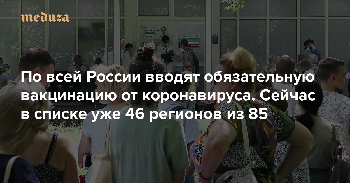 На фоне роста заболеваемости COVID-19 в российских регионах в том или ином виде начали вводить обязательную вакцинацию — чаще всего для сотрудников сфер услуг, торговли, здравоохранения, транспорта и культуры, а также чиновников. Во многих регионах в короткие сроки нужно привить минимум 60% от всех сотрудников. 16 июня пресс-секретарь президента РФ Дмитрий Песков сказал, что по всей России «по-прежнему никакой обязательной вакцинации нет». Этот материал впервые был опубликован 21 июня, но мы постоянно его обновляем. Последнее обновление — 2 августа.
