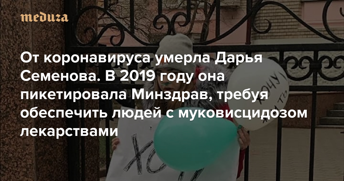 В возрасте 26 лет умерла Дарья Семенова, которая в 2019 году вышла на одиночный пикет к зданию Минздрава РФ с требованием обеспечить людей с муковисцидозом лекарствами. О смерти Семеновой 30 июня сообщила в фейсбуке Майя Сонина, руководитель благотворительного фонда «Тепло сердец».