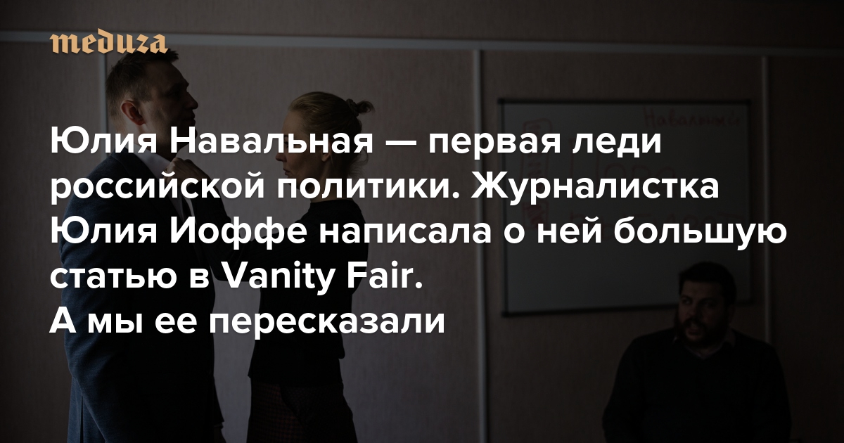 Журнал Vanity Fair опубликовал большую статью о Юлии Навальной, жене политика Алексея Навального. Ее написала американская журналистка российского происхождения Юлия Иоффе. Статья построена на интервью с друзьями и знакомыми Навальной, а также на воспоминаниях Иоффе, которая с ней общалась. Сама героиня текста отказалась давать интервью для статьи. «Медуза» пересказывает текст Vanity Fair.