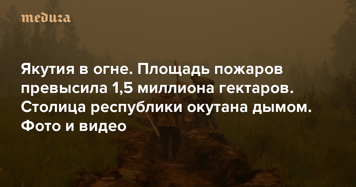 В Якутии сильнейшие пожары. На территории республики, по данным на 19 июля, зафиксировано 216 очагов возгорания, огонь прошел более 1,5 миллиона гектаров. Столица республики — Якутск — окутана дымом. Из-за задымления была нарушена работа аэропорта и приостановлено паромное сообщение на реке Лене. Предельно допустимая концентрация (ПДК) загрязняющих веществ в воздухе в Якутске превышена в 1,7-3 раза. В тушении пожаров в регионе задействовано более двух тысяч человек и 284 единицы техники, в том числе самолет-амфибия Бе-200. Якутия — один из самых пожароопасных регионов России, природные пожары в республике, более 83% территории которой покрыто лесами, происходят ежегодно.