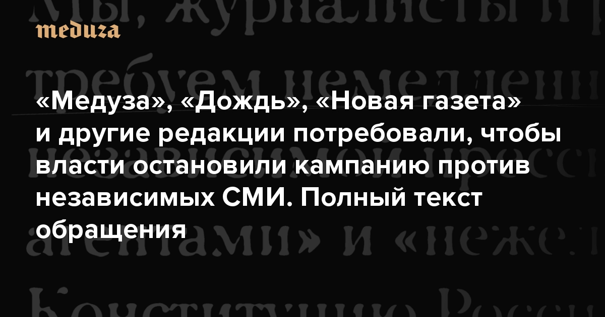«Медуза», «Дождь», «Новая газета», Forbes и другие редакции потребовали, чтобы власти остановили кампанию против независимых СМИ Полный текст обращения (версия «Медузы»)