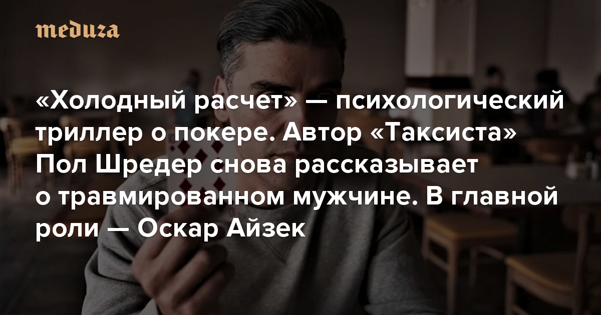 Сценарист «Таксиста» и «Бешеного быка» Пол Шредер снял картину, вновь рассказывающую о сильном травмированном мужчине. «Холодный расчет» показали на Венецианском кинофестивале (премьера картины в России пройдет 23 сентября). Главный герой — хладнокровный игрок в покер Уилл (Оскар Айзек), который в прошлом был охранником в иракской тюрьме и пытал заключенных. Кинокритик «Медузы» Антон Долин рассказывает, как эта история зарифмовалась с реальностью после вывода американских войск из Афганистана.