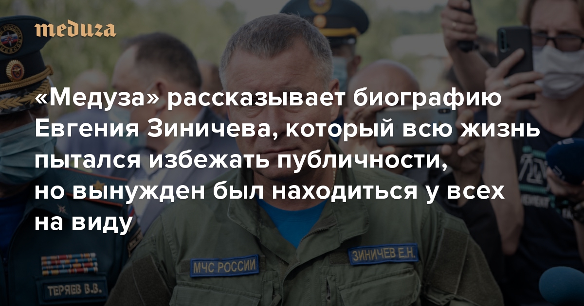 В среду, 8 сентября, на озере Лама в 120 километрах от Норильска погиб глава МЧС Евгений Зиничев. В пресс-службе министерства сообщили, что инцидент произошел «во время учений»: Зиничев пытался спасти режиссера Александра Мельника, который стоял вместе с Зиничевым «на краю выступа». Мельник поскользнулся и упал в воду. Такую же версию (без указания источника) в своем телеграм-канале представила глава RT Маргарита Симоньян. В Норильск Мельник (автор фильмов «Новая земля» и «Территория») приехал, чтобы подготовиться к съемкам нового документального проекта, посвященного развитию Арктики и Северного морского пути. Режиссер тоже погиб. «Медуза» рассказывает биографию Евгения Зиничева — «бывшего охранника Путина», который всю жизнь пытался избежать публичности, но в последние годы вынужден был все время находиться у всех на виду.