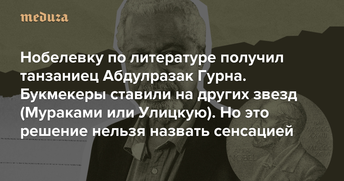 Нобелевку по литературе получил танзаниец Абдулразак Гурна Букмекеры ставили на других звезд, включая Мураками и Улицкую. Но назвать это решение сенсацией не получается