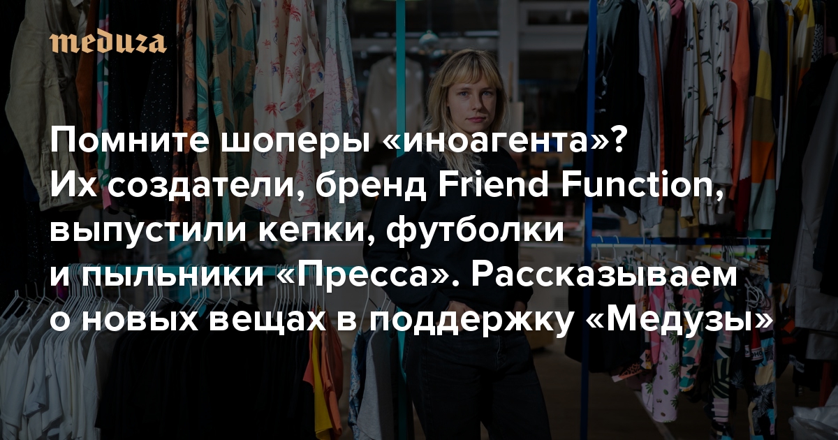 Помните шоперы «иноагента»? Их создатели, бренд Friend Function, выпустили кепки, футболки и пыльники «Пресса» Рассказываем о новых классных вещах, сделанных в поддержку «Медузы»