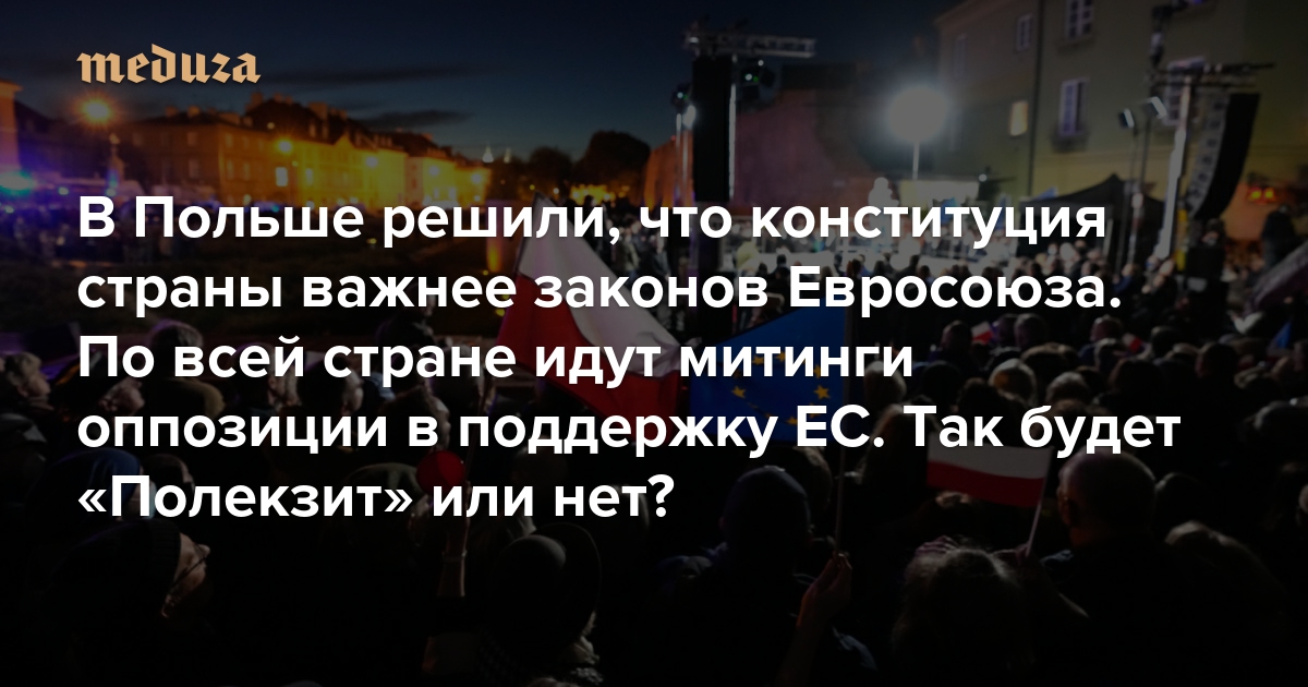 В начале октября Конституционный суд Польши постановил, что конституция страны имеет приоритет над законодательством Европейского союза. Формально этот ход польских властей чреват выходом Польши из ЕС. Тем более что в Евросоюзе и так давно недовольны последовательным наступлением на независимые СМИ и гражданские свободы со стороны консервативного правительства страны. А польская оппозиция уже проводит массовые проевропейские митинги по всей стране и за рубежом. Специально для «Медузы» журналист Станислав Кувалдин объясняет, насколько реальна перспектива «Полекзита».