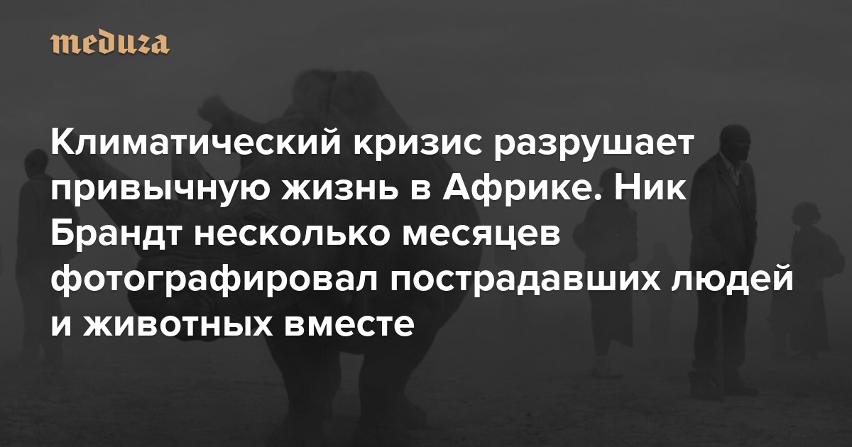 Ник Брандт — британский фотограф, который провел почти два десятилетия, снимая дикую природу Африки и то, что осталось от нее после прихода человека. Сейчас выходит его новый масштабный фотопроект «День может наступить», который экспонируется в галереях по всему миру: в Лондоне, Лос-Анджелесе, Осло, Дубае и в других городах. Брандт вместе фотографировал людей и животных, одинаково пострадавших от засух, наводнений, исчезновения привычных мест обитания и других тяжелых последствий изменения климата. Вся серия снята почти исключительно в монохромной гамме, исчезающие животные и потерявшие дом люди на этих фотографиях наполовину растворены в утреннем тумане, подчеркивающем неустойчивость их положения. Каждый снимок Брандт сопровождает историей его героев — и людей, и животных, «Медуза» публикует их без изменений. Историю появления самого фотопроекта и подробности организации съемок вы можете прочесть в интервью Брандта.