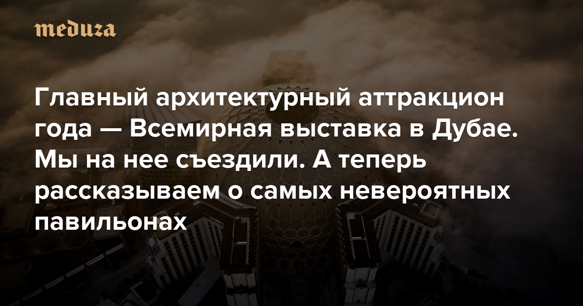 Всемирная выставка (также известна как Экспо) открылась в Дубае 1 октября. Архитектурный журналист Ася Зольникова уже побывала в ОАЭ и посмотрела на главное архитектурное событие года. А там и правда есть, на что посмотреть. Нидерланды предлагают посетителям зайти в павильон, на стене которого растут грибы, Великобритания выводит на фасад стихи, написанные нейросетью, а под куполом российского здания светится огромный разноцветный мозг. По просьбе «Медузы» автор рассказывает, что необходимо знать о Всемирной выставке, которая проходит уже 170 лет (и подарила миру не только Эйфелеву башню!) — и какие павильоны при случае точно стоит посетить.