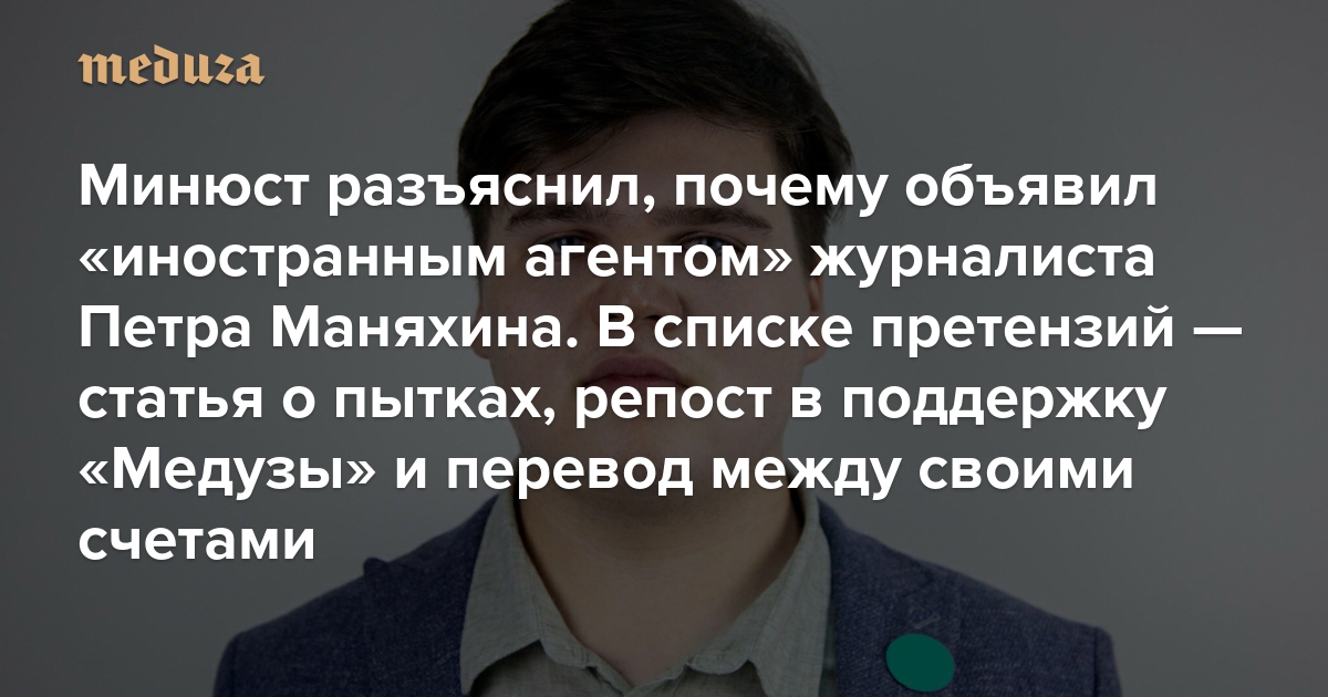 Минюст разъяснил, почему объявил «иностранным агентом» журналиста Петра Маняхина. В списке претензий — статья о пытках, репост в поддержку «Медузы» и перевод между своими счетами