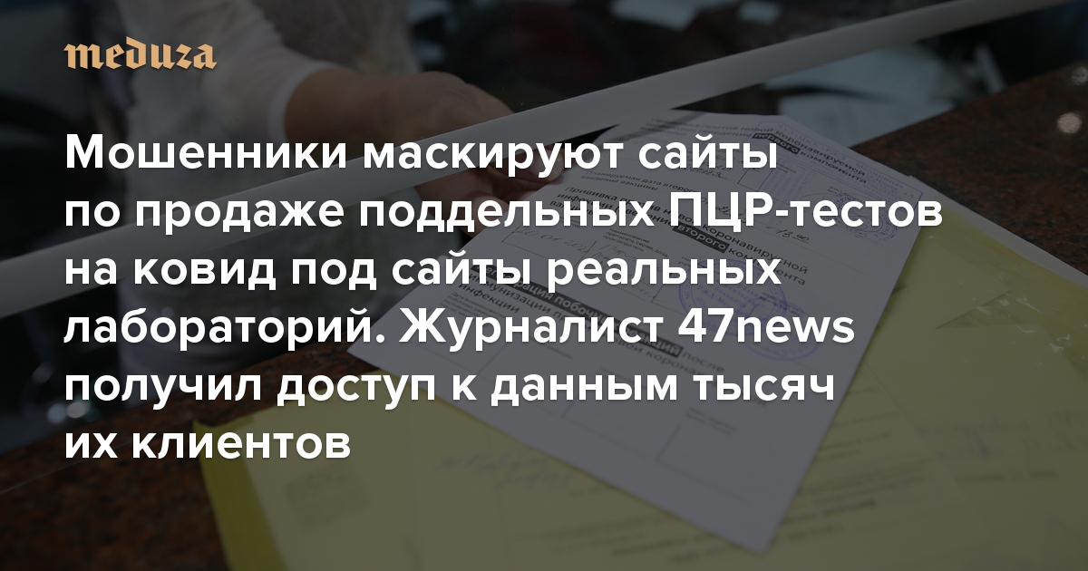 Сотрудник петербургского издания 47news Виктор Смирнов негласно получил доступ к административной панели сайта мошенников, торгующих поддельными результатами ПЦР-тестов на коронавирус. Об этом он рассказал в статье издания. По словам журналиста, преступники создали несколько сайтов — клонов лабораторий «Инвитро», «Гемотест» и «АрхиМед», где можно заказать и получить фальшивую справку. В материале издания перечислены адреса поддельных сайтов (ни один из них сейчас не доступен по прямой ссылке).