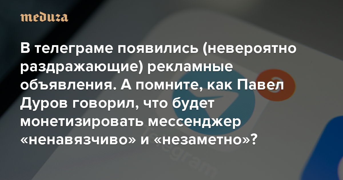 В телеграме появились (невероятно раздражающие) рекламные объявления. А помните, как Дуров говорил, что будет монетизировать мессенджер «ненавязчиво» и «незаметно»? Цепочка обещаний