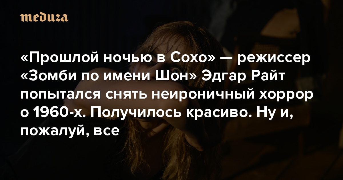 25 ноября в прокат выходит фильм «Прошлой ночью в Сохо» режиссера Эдгара Райта, снявшего несколько сверхпопулярных комедий: «Зомби по имени Шон», «Армагеддец», «Типа крутые легавые», «Скотт Пилигрим против всех». В новой работе Райт отказывается от иронии и всерьез берется за фильм ужасов о путешествии во времени: девушка из настоящего переносится в 1960-е, где становится свидетельницей темной стороны этого десятилетия. Кинокритик «Медузы» Антон Долин рассказывает, почему эксперимент Райта не удался.