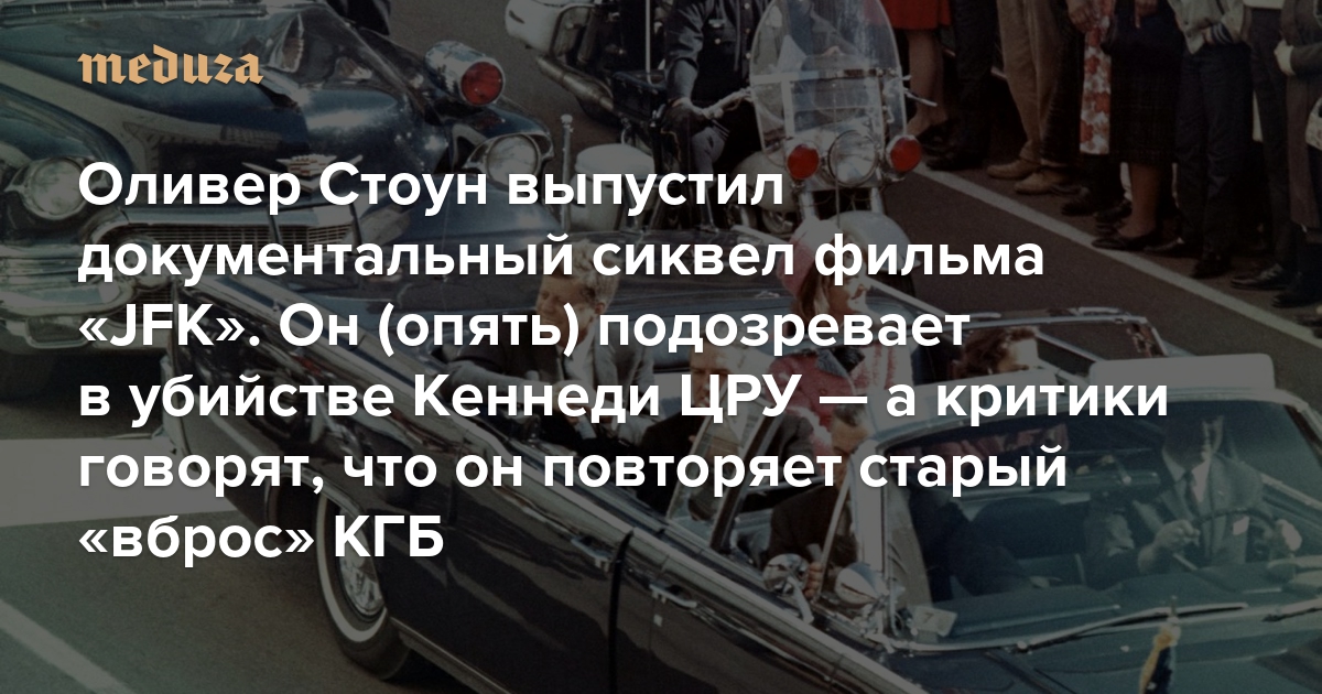 В прокат выходит фильм «JFK Revisited: Through The Looking Glass» («Возвращаемся к JFK: В Зазеркалье»). JFK — не только инициалы 35-го президента США Джона Фицджеральда Кеннеди и международный код нью-йоркского аэропорта его имени, но и название художественного фильма Стоуна 1991 года, который получил ряд престижных наград, в том числе два «Оскара» (за лучшую операторскую работу и монтаж). В то же время фильм подвергся резкой критике за конспирологическую версию гибели Кеннеди, а журнал Time в 2011 году включил его в список 10 самых недостоверных исторических кинолент. Стоун фактически обвинил американские спецслужбы — в первую очередь ЦРУ — в сговоре ради устранения политически неудобного для них президента. При этом влияние идей этого фильма на американское общество оказалось настолько велико, что «ЦРУ убило Кеннеди» до сих пор является одной из самых популярных в США теорий заговора. Более того, именно под влиянием фильма Оливера Стоуна конгресс США в 1992 году принял закон о рассекречивании всех документов, связанных с убийством Кеннеди. Об этом прямо говорится в финальном отчете правительственной комиссии, созданной для выполнения условий этого закона. «Медуза» рассказывает, как книга, вдохновившая Стоуна на съемку его хита 1991 года, была, возможно, одной из самых успешных идеологических операций КГБ за рубежом.