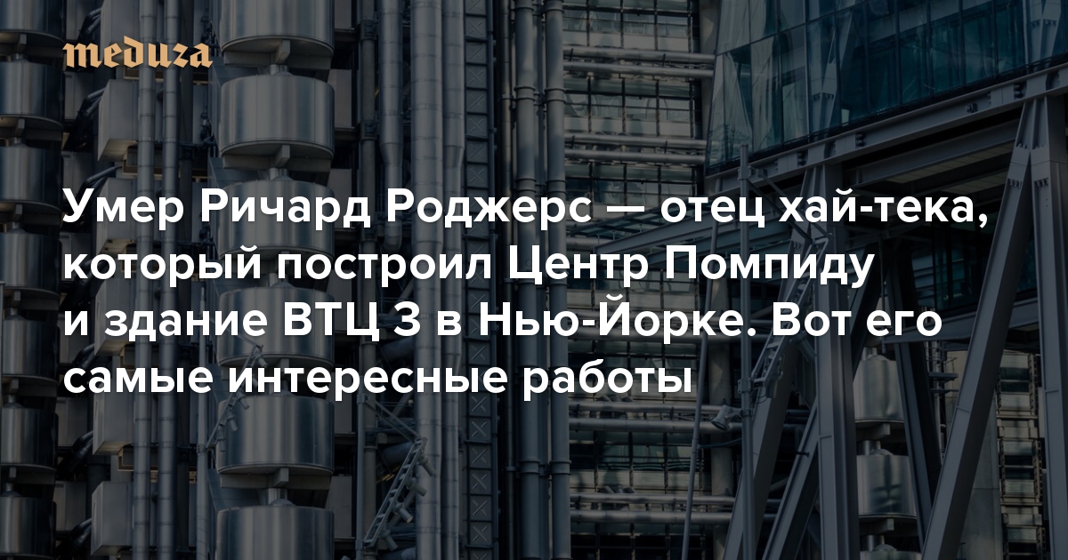 18 декабря в Лондоне умер архитектор Ричард Роджерс. Ему было 88 лет. Наряду с Ренцо Пьяно, Норманом Фостером и Николасом Гримшоу Роджерс считается основоположником стиля хай-тек и одним из самых влиятельных архитекторов мира. Пожалуй, самая известная работа Роджерса — построенный в 1977 году Центр Жоржа Помпиду в Париже. Также он участвовал в проектировании здания Европейского суда по правам человека в Страсбурге, штаб-квартиры страхового агентства Lloydʼs в Лондоне, терминала аэропорта Барахас в Мадриде и других зданий. «Медуза» вспоминает наиболее примечательные работы архитектора.