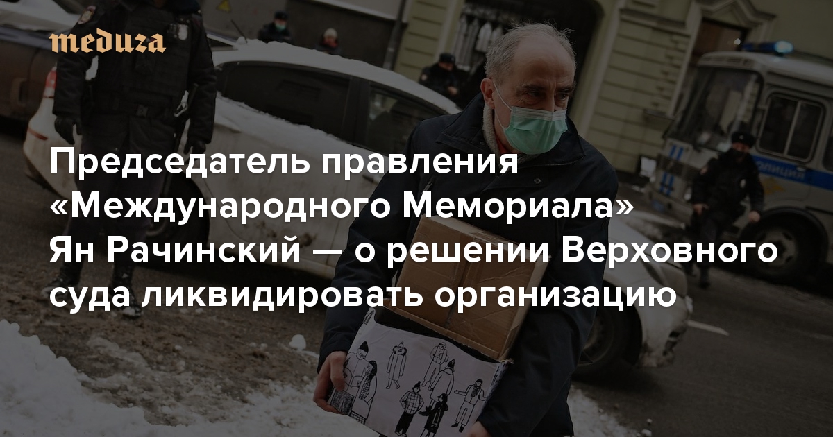 Сегодня, 28 декабря 2021 года, Верховный суд принял решение о ликвидации «Международного Мемориала» — важнейшей и наиболее авторитетной правозащитной организации в России. С таким требованием к суду обратилась Генеральная прокуратура. По мнению ведомства, «Мемориал» много раз нарушал требования законодательства об «иностранных агентах» (правда, убедительных доказательств этому прокуратура не предъявила). Аналогичный иск московская прокуратура подала к правозащитному центру «Мемориала» — суд рассмотрит его 29 декабря. «Медуза» поговорила с председателем правления «Международного Мемориала» Яном Рачинским о том, как организация будет работать дальше и что изменит решение Верховного суда.
