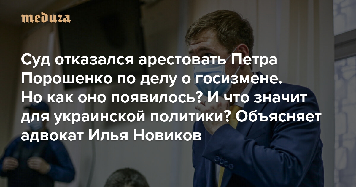 17 января бывший президент Украины Петр Порошенко вернулся в Киев, где ему грозил арест по делу о государственной измене. В тот же день Печерский районный суд провел заседание по этому вопросу, но решение было вынесено только спустя два дня. Арестовывать Порошенко не стали, суд назначил меру пресечения в виде «личного обязательства». О том, что это значит и как появилось уголовное дело в отношении бывшего президента, спецкор «Медузы» Кристина Сафонова поговорила с адвокатом Порошенко Ильей Новиковым.