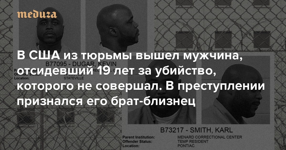 В США 44-летний Кевин Дугар вышел из тюрьмы, отсидев почти 20 лет по обвинению в убийстве. Отпустить Дугара под залог суд в Чикаго распорядился спустя девять лет после того, как его брат-близнец — Карл Смит — заявил о том, что преступление на самом деле совершил он. The Guardian рассказывает историю братьев.