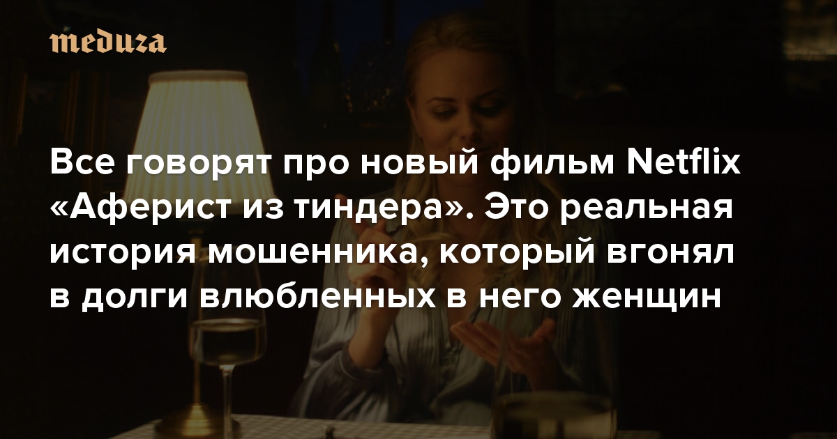 2 февраля стриминговый сервис Netflix показал документальный фильм «Аферист из тиндера». Он посвящен уроженцу Израиля Саймону Леваеву, который, по всей видимости, знакомился с женщинами в тиндере, притворяясь богатым бизнесменом, а затем выманивал у них крупные суммы и тратил их, чтобы добиваться других женщин. В фильме снялись три его жертвы. «Аферист из тиндера» вышел на первое место в трендах Netflix в России. «Медуза» рассказывает историю этого человека.