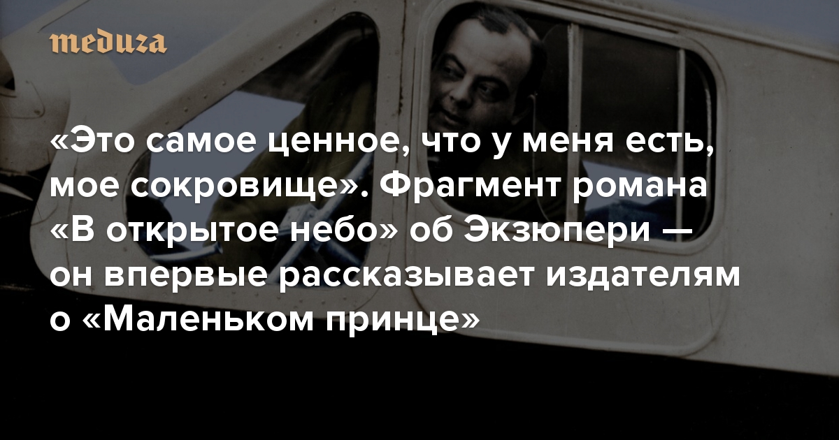 В издательстве Popcorn Books выходит роман испанского писателя Антонио Итурбе «В открытое небо» (перевод Елены Горбовой) о жизни Антуана де Сент-Экзюпери. Автор рассказывает о службе писателя в авиации во время Второй мировой войны вместе с его друзьями, французскими летчиками Жаном Мермозом и Анри Гийоме. С разрешения издательства «Медуза» публикует фрагмент романа, в котором Сент-Экзюпери впервые рассказывает издателям о «Маленьком принце».