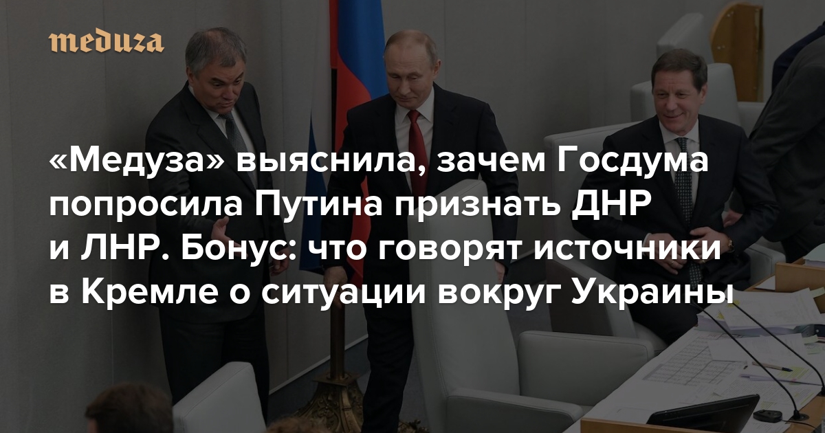 «Постоянные заявления о новых датах вторжения поднадоели» «Медуза» выяснила, зачем Госдума попросила Путина признать ДНР и ЛНР. Бонус: что говорят источники в Кремле о ситуации вокруг Украины