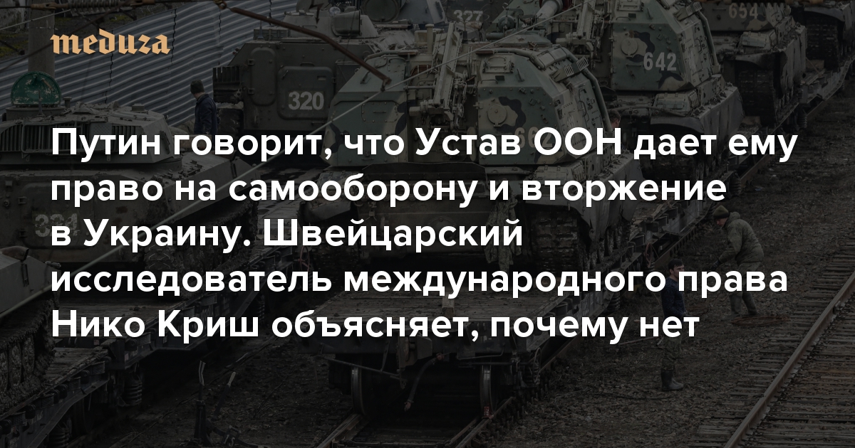 Рано утром 24 февраля Владимир Путин фактически объявил войну Украине. При этом он сослался на 51 статью Устава ООН, гарантирующую странам право на индивидуальную или коллективную самооборону. Эта же статья была явно упомянута в договорах о дружбе, сотрудничестве и взаимной помощи России с Донецкой и Луганской народными республиками, подписанных 22 февраля — на следующий день после признания Путиным их независимости. Руководство ДНР и ЛНР сразу воспользовались союзническим статусом и попросили РФ помощи «в отражении агрессии вооруженных сил и формирований Украины». «Медуза» поговорила с профессором Женевского института международных отношений Нико Кришем о том, что это за статья и имел ли Кремль право пользоваться ей.