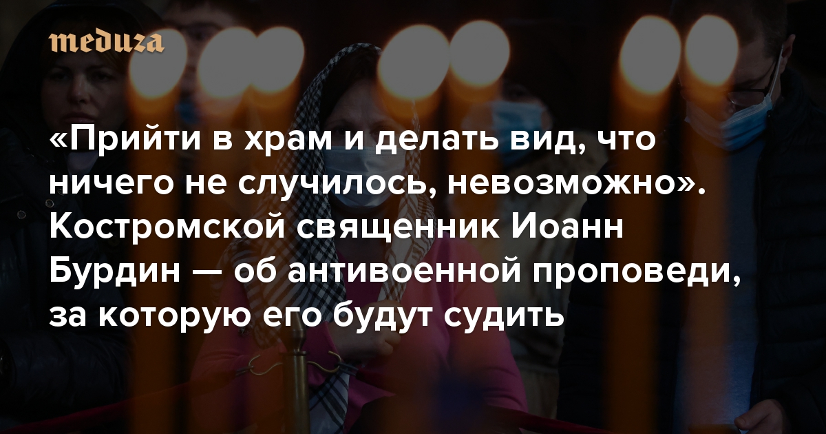 Шестого марта 50-летний иерей Иоанн Бурдин, настоятель церкви Воскресения Христова в деревне Карабаново Костромской области, на воскресной литургии произнес антивоенную проповедь. По предположению священнослужителя, один из прихожан пожаловался на проповедь в полицию, и в тот же день на священника составили протокол по новой статье КоАП. «Медуза» поговорила с отцом Иоанном о суде и о том, как церковь должна реагировать на войну.