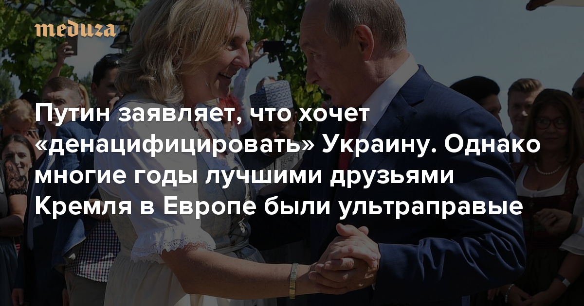 Одна из декларируемых Кремлем целей нападения на Украину — «денацификация» этой страны. По официальной версии, власть там все последние годы находится под влиянием неонацистов. Между тем у официальной Москвы со времен присоединения Крыма не было больших друзей в Европе, чем ультраправые Германии, Франции, Италии и Австрии. Функционеры этих партий приезжали на выборы в Крым и Донбасс, требовали отменить санкции против России, дружили с главой Чечни Рамзаном Кадыровым, идеологом российского неоимперства Александром Дугиным, православным бизнесменом Константином Малофеевым и, если судить по утечкам в СМИ, щедро вознаграждались Кремлем. Более того, их позиция по многим вопросам напоминала идеи украинских крайне правых (которые, к слову, по итогам последних выборов вообще не попали в Верховную Раду) — защита «традиционных ценностей», неприятие мигрантов и до той или иной степени пересмотр общественного консенсуса вокруг Второй мировой войны. «Медуза» рассказывает о главных друзьях Кремля в Европе.