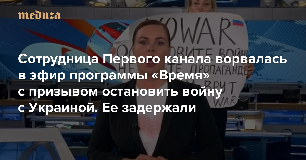 Вечером 14 марта сотрудница Первого канала, редактор Марина Овсянникова выступила в прямом эфире с антивоенным высказыванием. Около 21:35 по московскому времени, когда ведущая программы «Время» Екатерина Андреева читала подводку к сюжету о противодействии западным санкциям, Овсянникова вошла в кадр с плакатом, на котором было написано: «No war. Остановите войну. Не верьте пропаганде. Здесь вам врут. Russians against war».