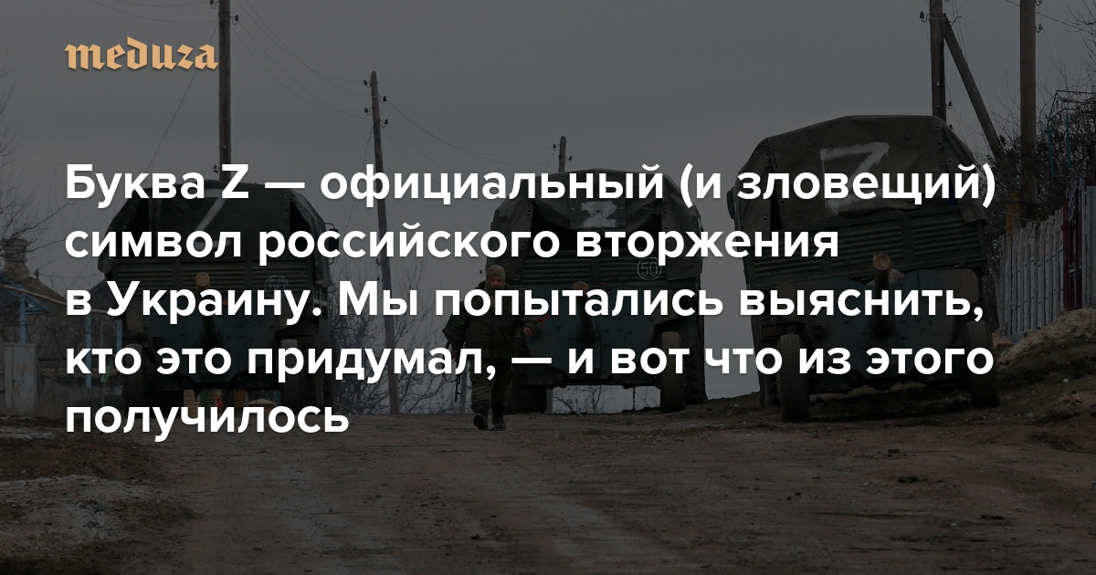 Первые снимки и видео, запечатлевшие российскую военную технику с непонятной маркировкой на борту, появились в соцсетях за несколько недель до начала войны. Чаще всего встречалась латинская литера Z — в квадрате или без него; но также была замечена и V. Скорее всего, буквы использовались как тактическая маркировка, позволяющая различать технику из разных военных округов России, — однако через несколько дней Z и V (но особенно Z) стали почти официальной символикой «спецоперации». Кто именно придумал сделать Z одним из ключевых элементов российской пропаганды, точно неизвестно. Организаторы акций и якобы стихийных флешмобов из регионов, которым поручили изобразить всеобщую народную поддержку вторжения, не понимают, что она означает. «Медуза» разыскала человека, который утверждает, что эта идея принадлежит ему и его единомышленникам, а государственная пропаганда просто взяла ее на вооружение.