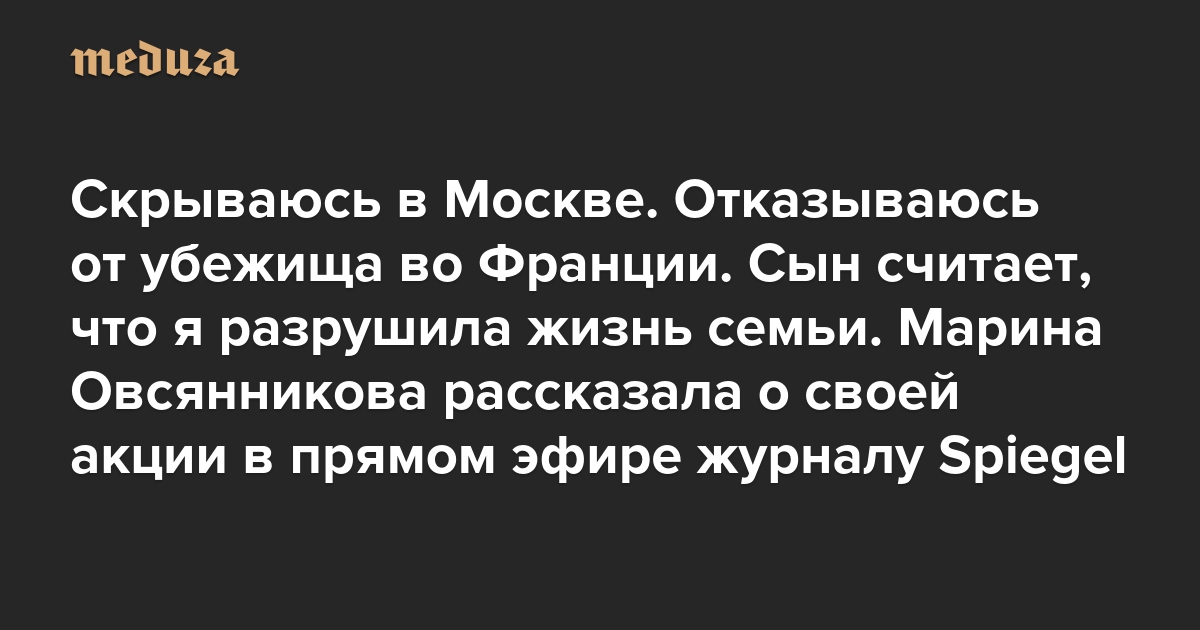 Скрываюсь в Москве. Отказываюсь от убежища во Франции. Сын считает, что я разрушила жизнь своей семьи Сотрудница Первого канала Марина Овсянникова рассказала о своей антивоенной акции немецкому журналу Der Spiegel