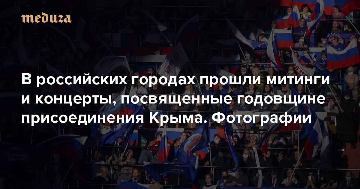 В крупнейших городах России 18 марта прошли митинги, шествия и концерты, посвященные восьмой годовщине вхождения Крыма в состав России. Самое массовое мероприятие состоялось в Москве на стадионе «Лужники» — в нем, по данным полиции, приняли участие 200 тысяч человек. Перед собравшимися выступил президент России Владимир Путин. Еще накануне сообщалось, что от бюджетников требовали посетить мероприятия в обязательном порядке, за это обещали дополнительный выходной или денежное вознаграждение. В Москве некоторых посетителей организованно привозили на автобусах, многие покинули концерт сразу после того, как отметились.