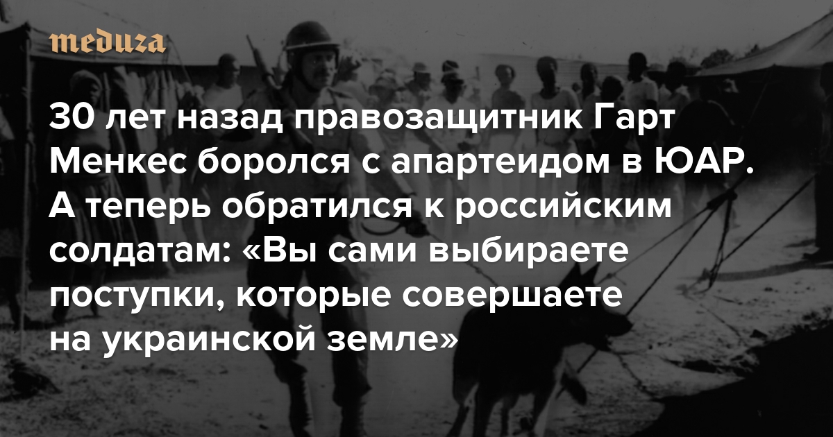Гарт Менкес — правозащитник из ЮАР, заставший расцвет апартеида юношей. Он был африканером, то есть принадлежал к белому меньшинству, в основном голландского происхождения, в чьих руках была сосредоточена почти вся политическая власть в стране. Несмотря на преследование со стороны властей и остракизм даже в собственной семье, Менкес участвовал в движении белых южноафриканских мужчин, которые из этических соображений отказывались служить в армии ЮАР по призыву и охранять не только внешние, но и внутренние границы апартеида. Основываясь на своем опыте юриста-правозащитника, который занимается проблемами геноцида и военных преступлений, Гарт Менкес написал обращение к российским солдатам, воюющим на территории Украины. Его полный текст опубликован в начале этого материала. Кроме того, Гарт специально для «Медузы» рассказал о своем опыте ненасильственного сопротивления диктатуре, в котором он видит много параллелей с судьбой гражданского общества в России во время войны с Украиной.