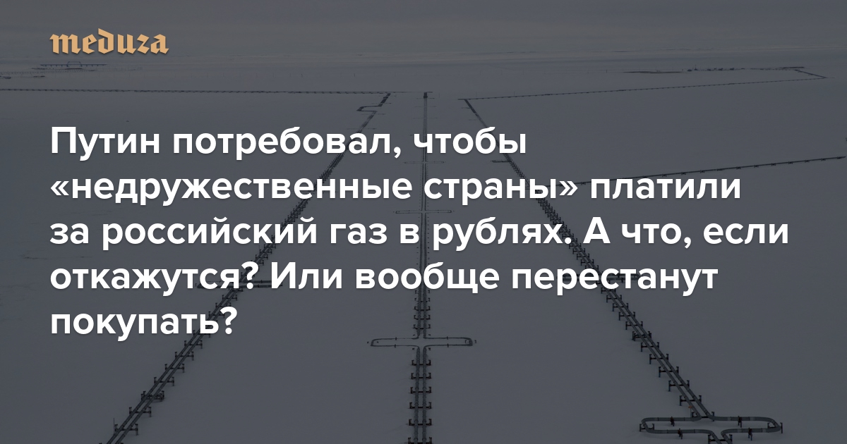 Президент России Владимир Путин поручил продавать российский природный газ так называемым недружественным странам только за рубли — поскольку заморозкой российских активов за рубежом, по его словам, «коллективный Запад перечеркнул доверие» к их валютам. Это решение выглядит неочевидным, и даже кажется, что оно может стать еще одним ударом по российской экономике (а не по «недружественным странам»). «Медуза» поговорила с директором Института энергетики и финансов Марселем Салиховым, чтобы понять, что теперь будет с «Газпромом», может ли Европа на самом деле отказаться покупать российский газ — и насколько серьезным в этом случае окажется ущерб для экономики.