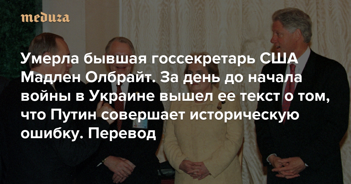 Умерла бывшая госсекретарь США Мадлен Олбрайт За день до начала войны в Украине The New York Times опубликовала ее колонку о том, что Путин совершает историческую ошибку. Мы перевели этот текст
