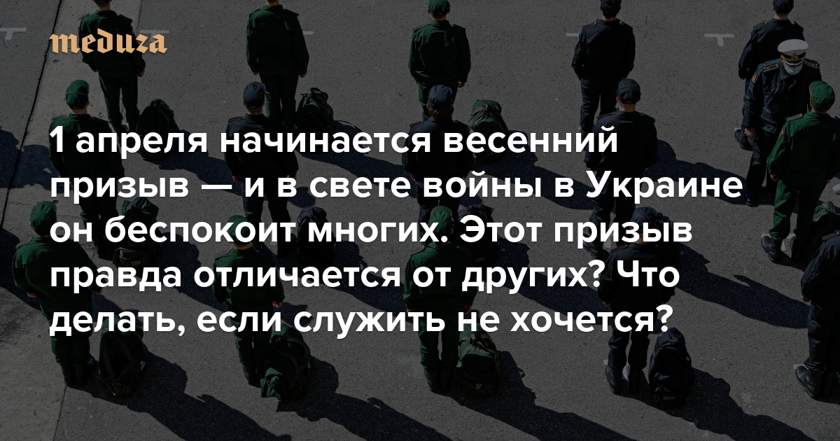 С 1 апреля по 15 июля 2022 года пройдет призыв молодых людей от 18 до 27 лет в российскую армию. Хотя министр обороны РФ Сергей Шойгу заявил, что мужчины, отправленные на срочную военную службу весной этого года, не будут участвовать в «спецоперации», есть ряд свидетельств о том, что на фронт войны в Украине отправляются и призывники, которых под давлением убедили подписать контракт, и просто обычные срочники (это признавало и само министерство обороны). Поэтому все больше российских юношей призывного возраста ищут способы избежать службы. «Медуза» рассказывает, как проходит весенний призыв и что можно сделать в ситуации, если человек не поддерживает войну или имеет родственников в Украине и опасается, что его, несмотря ни на какие официальные заявления, могут отправить в зону боевых действий.